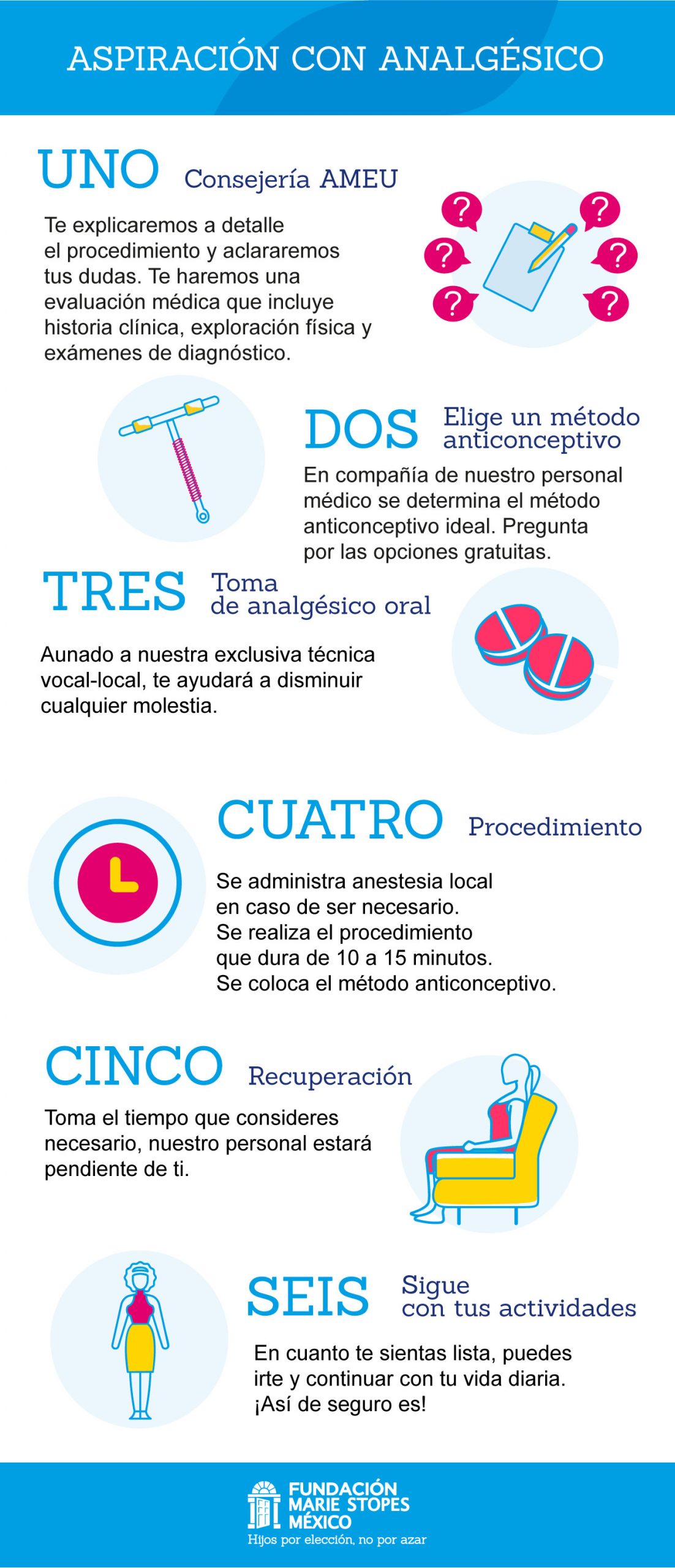 En nuestra consejería, nuestro personal médico te hará una evaluación médica que incluye historia clínica, exploración física y exámenes de diagnóstico, te explicará el procedimiento y aclarará tus dudas. También tendrás una explicación sobre los métodos anticonceptivos que manejamos y si el médico así lo recomienda podrías optar por alguno, entre ellos, el que ofrecemos gratuitamente (DIU T de cobre).